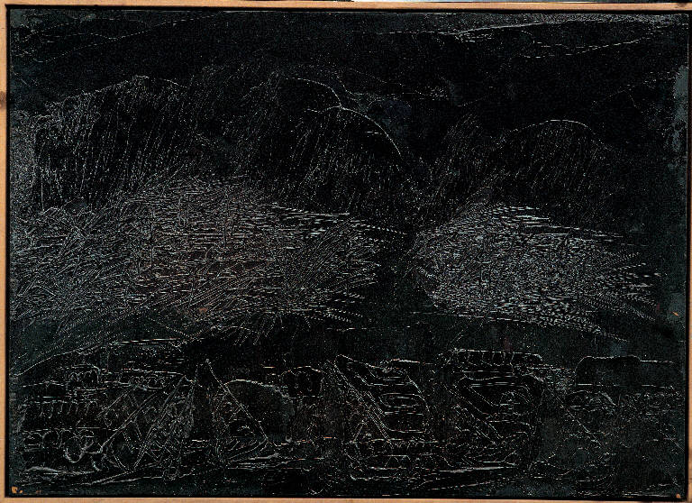 - NOTIZIE STORICO CRITICHE Il paesaggio che Congdon ammira durante lo spostamento in taxi da Sana'a a Taiz ispira un'importante serie dedicata ai villaggi nel deserto yemenita. Si osservi in quest'opera l'intricata veduta notturna della città di Taiz è affidata alle fitte incisioni, che dai rilievi accompagnano, digradando, alle architetture del centro.