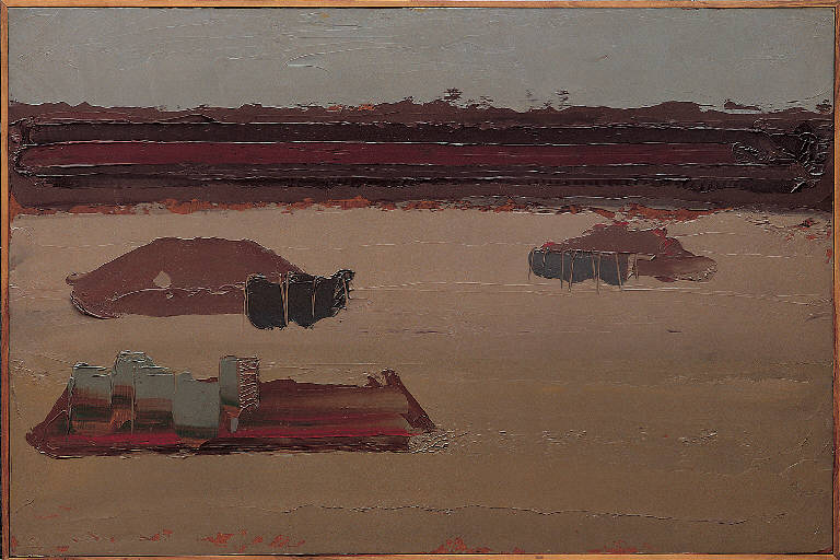 - NOTIZIE STORICO CRITICHE In Deserto Yemen, 6 del '71, Congdon si concede a un lirismo pittorico che quasi si consuma e svapora nella delicatezza di un acquarello: le tre masse si sciolgono in un silenzio di sabbia e luce dove compaiono due solide e dense spatolate orizzontali rosse e nere che, come un architrave (Balzarotti, 1992) sostengono e consolidano l'intera composizione.