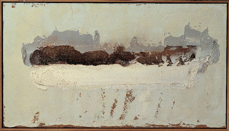 - NOTIZIE STORICO CRITICHE Nel porto di Brindisi, Congdon vede la carcassa incendiata dell'Heleanna, il traghetto per la Grecia. E' alquanto significativo che nel diario di viaggio non vi sia nessun riferimento alla vista della nave, che pur dovette lasciare all'artista una forte impressione, visto che ritornerà sullo stesso soggetto anche l'anno successivo, con una seconda e molto impegnativa serie di opere. Le uniche tracce documentali di cui disponiamo sono dei veloci schizzi sul taccuino: uno scafo, alcune note sui colori da impiegarsi e le svariate impressioni avvertite. Infine, su di un solo disegno, e probabilmente scritto in un secondo momento, il nome della nave. A differenza delle petroliere nigeriane già in viaggio, a questa non sarà più possibile navigare: ed ecco il motivo per cui l'Heleanna diviene, più di tanti soggetti, il simbolo della morte. Attorno al suo scheletro-carcassa non ci sono più il mare e in cielo divisi dall'orizzonte, ma, ora, solo il nulla sorregge l'imbarcazione.