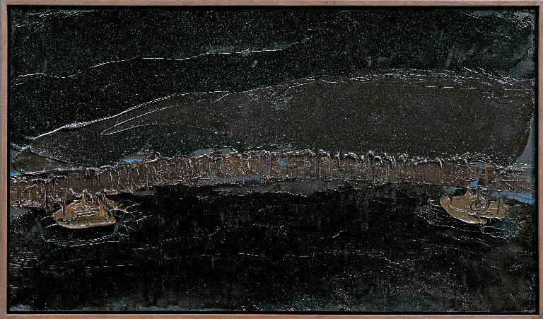 - NOTIZIE STORICO CRITICHE I paesaggi, realizzati nel momento in cui Congdon concentrava la quasi totalità della sua ricerca espressiva nella rappresentazione del Crocefisso, anche se caratterizzati dalla volontà di depurare il segno da ogni descrittivismo, sono contrassegnati dal tentativo di recuperare una prossimità con il reale, con il "modello" che denuncia, appunto, la sopravvivenza di un dato oggettivo. A tale proposito, infatti, Congdon scrive: "la concretezza nel dipingerla dovrebbe mettere osso nei Crocifissi in quanto questi tendono ad andare verso l'informe!". La composizione lascia trasparire, nelle larghe e piatte masse cromatiche, una certa ascendenza espressionistica maggiormente prossima, però, a una condotta pittorica morbida e arrotondante che, pure nel tratto sottile e minuzioso affidato all'incisione, ripropone un concetto di paesaggio come un insieme plastico e musicale di forme e macchie cromatiche nel quale bilanciare linee, masse, colori e architetture.