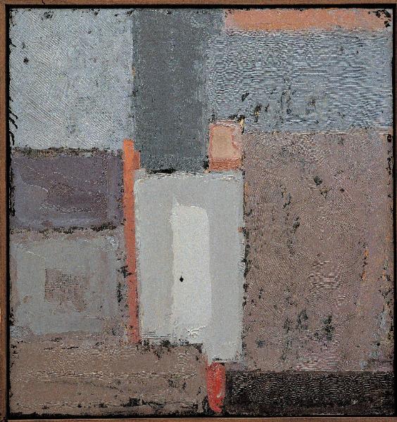 - NOTIZIE STORICO CRITICHE La funzione propriamente costruttiva, strutturale, delle note di colore prevale in un'opera inedita, come denuncia il titolo: "Novità (81)". La estrema economia del gesto si traduce in un serrato incastro di tessere cromatiche dagli assi ortogonali, con un effetto, quasi, di "astratta" geometria, ormai abolito ogni riferimento alla profondità prospettica e alla partitura cielo-terra. Tuttavia il doppio rettangolo introduce un dislivello nel compatto tessuto dell'opera, privo di incisione e di tono più chiaro e luminoso, una sorta di finestra al centro del dipinto.