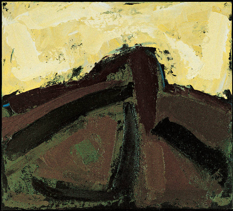 - NOTIZIE STORICO CRITICHE La serie Estate del 1981 (18 dipinti eseguiti dal 14 luglio al 10 settembre) è certamente una delle più ricche. In realtà, a una più attenta analisi, emergono delle sottoserie e anche alcuni esemplari irriducibili a una tipologia generale. La sottoserie più ricca si inizia con i numeri 3 e 4 e culmina con il 13 e 14. In tutte è evidente la struttura del Campo G., ben identificata dal contorno angolare del fosso. Soprattutto notevole è la massa del cespuglio sulla destra la cui posizione e forma variano notevolmente da un dipinto all'altro fino ad assumere un rilievo particolare nel 13 e 14, due opere quasi sovrapponibili per impianto compositivo ma assolutamente in antitesi sotto il profilo cromatico. Qui la massa del cespuglio subisce una spinta verso l'alto che va a incurvare l'orizzonte, con una tensione organica che fa pensare alla testa di taluni crocefissi o a certe vedute monumentali degli anni '50 (Basilica marciana, Acropoli di Atene, Basilica assisiate, ecc.).