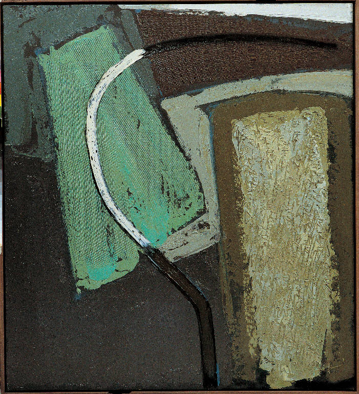 - NOTIZIE STORICO CRITICHE Il formato più ampio conferisce un aspetto monumentale alle masse di colore di "Autunno 22", in cui i campi appaiono piuttosto visti dall'alto, occupando così l'intero dipinto con le loro tonalità brune e spente, appena ravvivate dal verde della marcita e dalla tenue doratura delle stoppie, mentre il cielo si riduce a un sottile striscia di colore perlaceo. Si accentua così l'impressione di sprofondare nelle viscere della terra bruna. Importante è nuovamente il lavoro dell'incisione che conferisce rilievo plastico alle superfici cromatiche. In contrappunto, l'artista inserisce però il singolare motivo lineare a forma di falce che attraversa l'intero dipinto dal basso verso l'alto, quasi a unire i vari blocchi dei campi, trascolorando dal nero al bianco. E' il motivo della strada o del sentiero che, ridotto quasi a puro motivo grafico, acquista anche un valore di emblema, una sorta di sigla con la quale l'artista si auto-include nella propria opera.