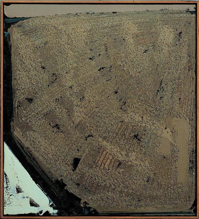 - NOTIZIE STORICO CRITICHE In "Autunno, 25, stoppie" assistiamo all'invasione della superficie del dipinto da parte della terra, in questo caso il vasto campo di stoppie che, da un invisibile punto prospettico, sembra irradiarsi fino al primo piano allargandosi a ventaglio (riproponendo, seppure rovesciato, il classico motivo dell'arena), dove viene arginato dal canale nero. A tale effetto prospettico contribuisce la "texture" dell'incisione, ormai uniforme e regolare e sempre rigorosamente contenuta entro il limite della massa di colore. Lo stretto bordo di cielo ha perduto la sua luce che, con inversione paradossale, si va a concentrare nell'angolo sinistro inferiore del dipinto (un campo innevato?).