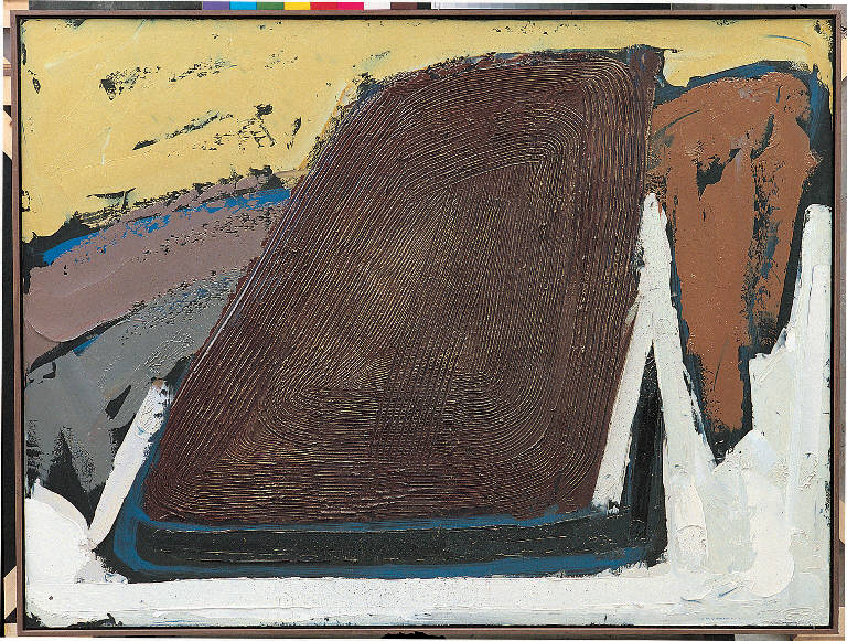 - NOTIZIE STORICO CRITICHE In "Campo G., 4" l'esuberanza materica della monumentale massa del campo fittamente incisa (memore di "Terra arida" del 1981) si erge quasi fluttuando al centro schiacciando sui lati i residui del paesaggio, sommariamente abbozzati con vigorosi colpi di spatola. Anche in questo caso osserviamo un rovesciamento di toni: caldi nel cielo, freddi nel margine inferiore della terra. Tanto più ne viene esaltata la stravagante collocazione spaziale della forma centrale.