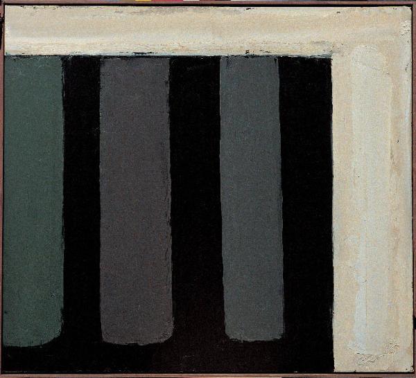 - NOTIZIE STORICO CRITICHE Alla serie "Terra bruna" dell'anno precedente sembra riallacciarsi "3 campi" della fine di novembre 1985: ma in questo caso il bordo neutro sui due lati (cielo?) assume realmente il ruolo di una cornice all'interno della quale si ritaglia un secondo rettangolo di un nero assoluto che va a esaltare l'accordo tonale dei tre campi a loro volta iscritti al suo interno. Questi sono ormai ridotti a semplici bande verticali, quasi note musicali (si noti l'accordo delicatissimo delle tre tinte, verde-grigio, grigio-viola e grigio beige, e la bilanciatura di freddo e di caldo) o comunque superfici traslucide da cui promana una intensa, per quanto appena percepibile, luminosità: una variante sul tema della finestra.