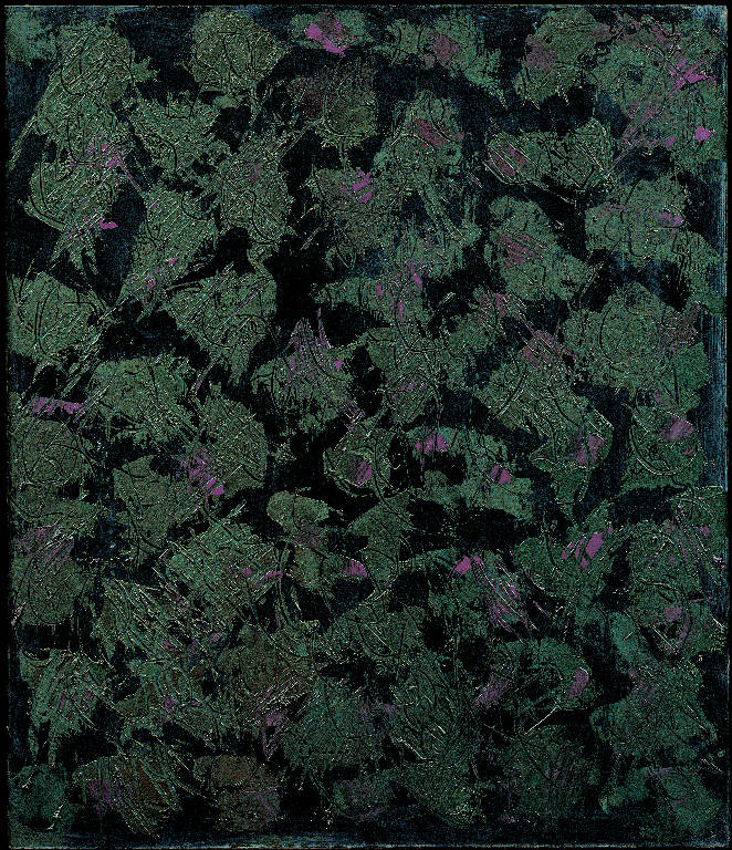 - NOTIZIE STORICO CRITICHE "Violette", primo di una serie, si inserisce nel filone tematico della rappresentazione dei fiori. Il pannello ne risulta totalmente invaso: essi sono infatti ripresi in un primo piano assoluto con un effetto di appiattimento ornamentale, che richiama alla memoria l'"all-over composition" più volte adottata dall'artista ai suoi esordi. La dominante cromatica - un blu notte scurissimo, illuminato da un tenero verde e dai tocchi del viola - e l'uso abbondante del nero conferiscono a questa raffigurazione del risveglio primaverile una tonalità paradossalmente notturna. Ma esiste anche una valenza aggiuntiva, nell'intento di partecipare quella che Fred Licht chiama «l'oscurità feconda dell'imperscrutabile grembo della terra»; diversamente da opere molto precedenti in cui si manifestava il conflitto tra il nero, segno del nulla, ed il colore, qui esso palesa, aggiunge Fred Licht, una «forza cromatica propria, ha funzione attiva e propositiva».