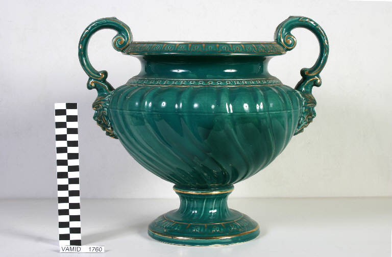 Vaso con piede circolare, corpo a baccellature a "S", largo collo con orlo a fogliette su cui sono fissate le anse a doppia voluta raccordate in basso a mascheroni. Cromia a smalto colore verde smeraldo, spruzzato con lumeggiature in oro.