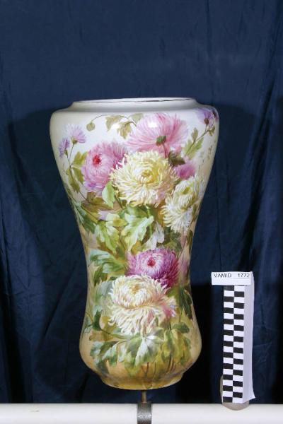 Portaombrelli a corpo liscio, svasato verso l'alto con lieve strozzatura nella metà inferiore, collo appena accennato. Nella parte frontale presenta una decorazione con crisantemi gialli e violacei. Rifinitura in oro molto sbiadita sull'imboccatura.