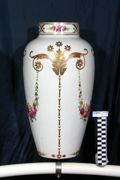 Portaombrelli a corpo liscio, svasato, con restringimento al collo. Decoro a ghirlande floreali policrome pendenti da volute vegetali in oro su fondo bianco (modulo decorativo ripetuto tre volte sul corpo del vaso); sul collo greca in oro con fiori.