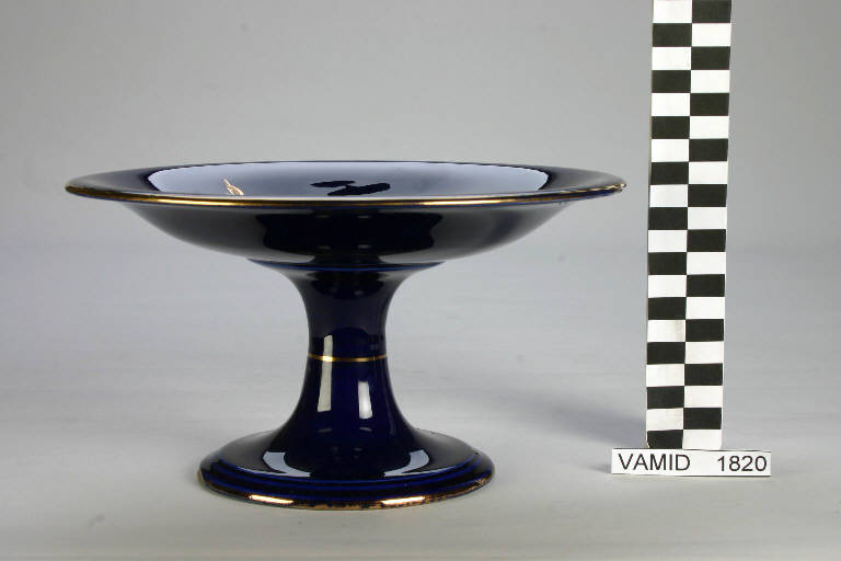Alzata smaltata in blu Sevrès con rifiniture in oro brillante sui bordi del piatto e del piede. Sul piatto è raffigurato un uccellino su un ramo fiorito eseguito in oro e argento e in parte a rilievo.