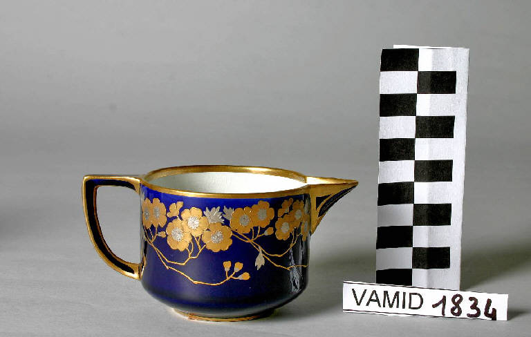 Lattiera decorata a motivi floreali a rilievo in oro e argento su fondo interamente smaltato in blu cobalto. Rifiniture in oro brillante.