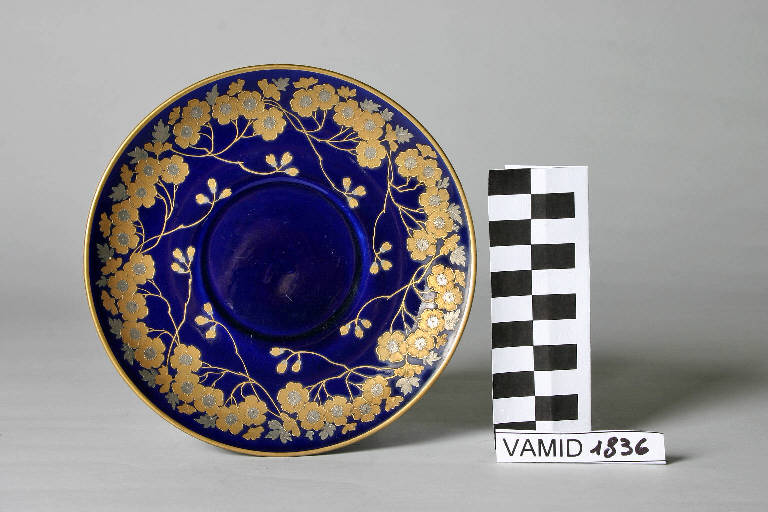 Piattino decorato a motivi floreali a rilievo in oro e argento su fondo interamente smaltato in blu cobalto. Rifiniture in oro brillante.