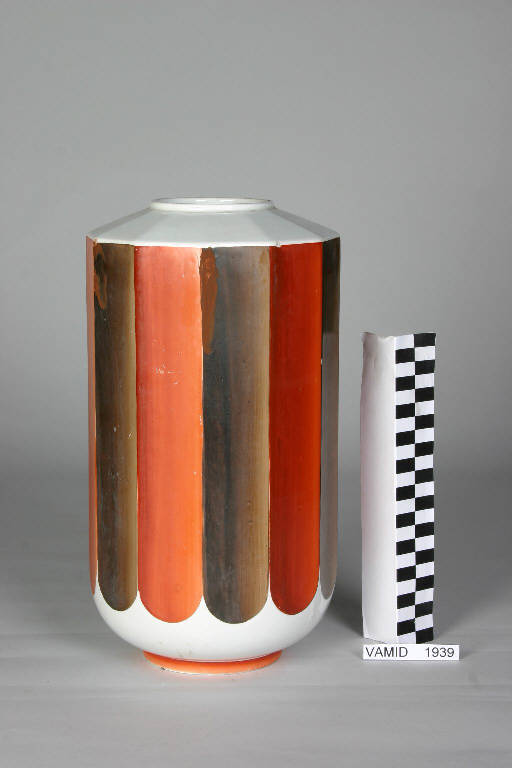 - NOTIZIE STORICO CRITICHE Il vaso, decorato a mano sopra vernice, è una tipica produzione di Guido Andlovitz che fu lo storico direttore artistico della Società Ceramica Italiana di Laveno dal 1923 al 1961. La forma prismatica del vaso si coniuga con la ricerca di una scomposizione cromatica suggerita dalle strisce verticali arancio e marroni, sfumate l'una nell'altra in passaggi intermedi.