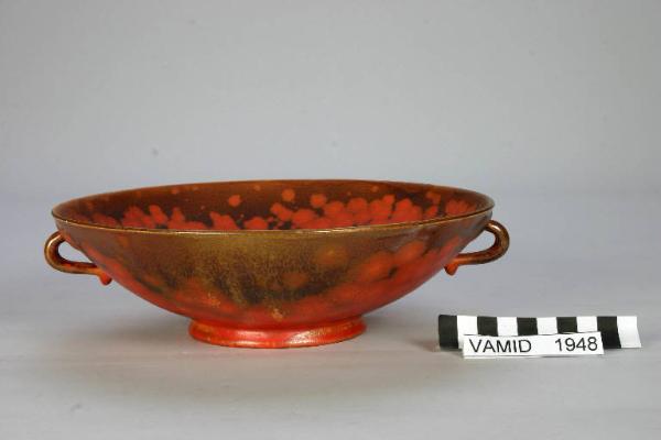 - NOTIZIE STORICO CRITICHE La coppetta, realizzata con la tecnica a colaggio, è stata decorata con smalto Vulcano a effetto macchiato. La forma del vaso fu realizzata nel 1930 (n. 1250/3, cfr. E. Biffi Gentili in "Guido Andlovitz. La commedia ceramica"). Il tipo fu disegnato da Guido Andlovitz che fu lo storico direttore artistico della Società Ceramica Italiana di Laveno dal 1923 al 1961: emerge anche in questo manufatto e nella particolare cromia (impostata sui toni del rosso e del marrone) lo studio della tradizione dell'arte ceramica, evidente nei ricordi dei manufatti ceramici delle antiche civiltà del Mediterraneo.