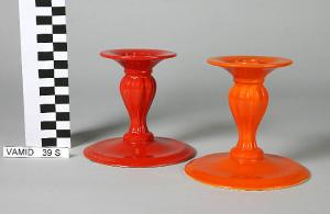 Piccolo candeliere da tavolo smaltato color arancione. Base circolare liscia leggermente gradinata, fusto a balaustro baccellato, piattello raccoglicera circolare.