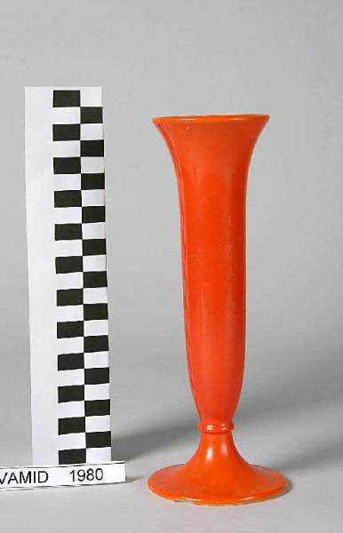 Vaso lungo e snello smaltato in rosso-arancione all'esterno e all'interno, senza alcuna decorazione. Piede circolare.