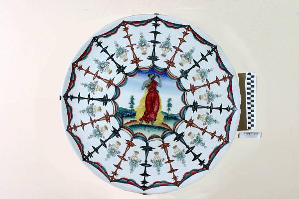 Grande piatto da parete con una figura femminile al centro e motivi a vasi scanditi a raggiera da elementi geometrici sulla tesa. Smaltato a colori vivaci su fondo bianco.