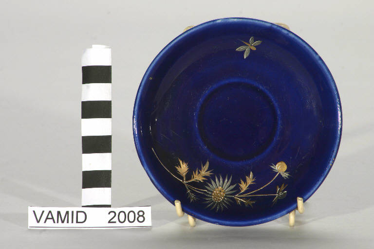 - NOTIZIE STORICO CRITICHE Il piattino fa parte di un servizio in blu cobalto databile tra la fine dell'Ottocento e l'inizio del secolo successivo. La coloritura blu è eseguita sottosmalto mentre i fiori sono realizzati in parte a rilievo a terzo fuoco in policromia e con oro brillante.