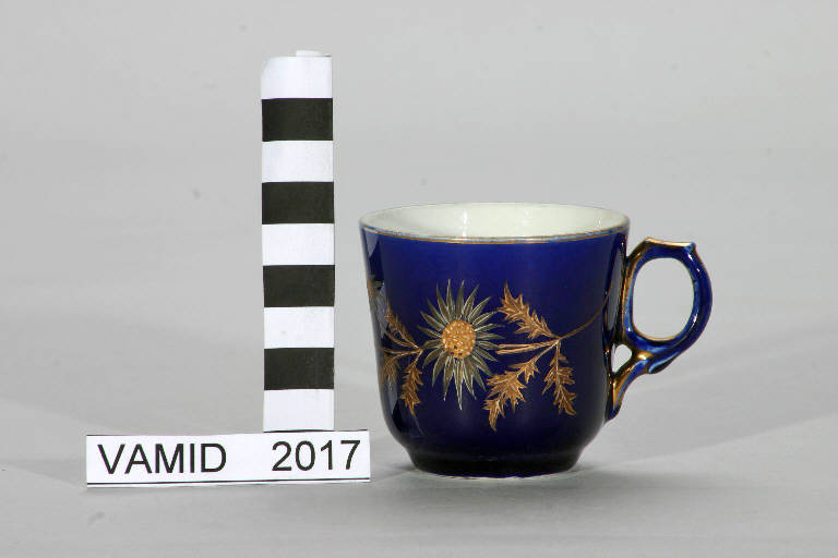 - NOTIZIE STORICO CRITICHE La tazzina fa parte di un servizio in blu cobalto databile tra la fine dell'Ottocento e l'inizio del secolo successivo. La coloritura blu è eseguita sottosmalto mentre i fiori sono realizzati in parte a rilievo a terzo fuoco in policromia e con oro brillante.