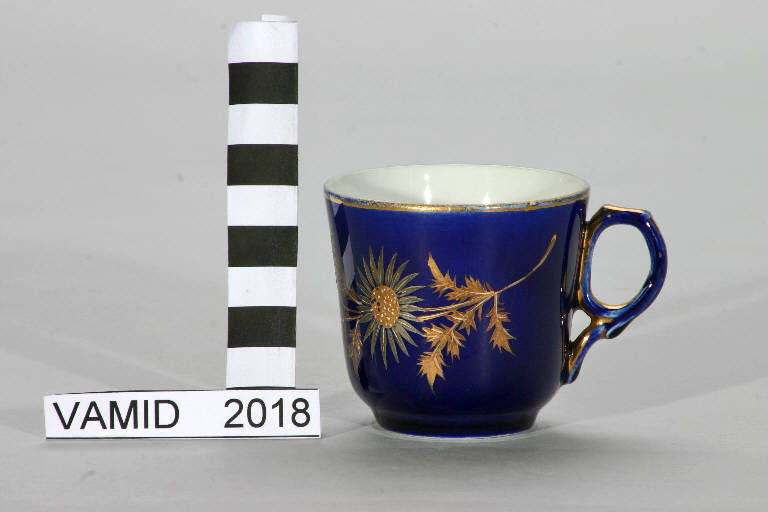 - NOTIZIE STORICO CRITICHE La tazzina fa parte di un servizio in blu cobalto databile tra la fine dell'Ottocento e l'inizio del secolo successivo. La coloritura blu è eseguita sottosmalto mentre i fiori sono realizzati in parte a rilievo a terzo fuoco in policromia e con oro brillante.
