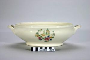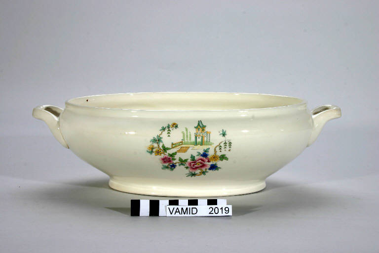 Zuppiera ovale con manici lisci e coperchio con orlo ondulato e manico a doppia voluta. Decoro con paesaggio orientale e motivi decorativi floraeli separati da una striscia di colore verde.