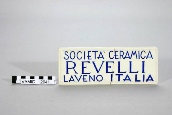 targa con iscrizione di Società Ceramica Revelli - ambito lavenese (sec. XX)