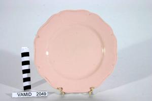 Piatto da frutta in pasta rosa con tesa sagomata a otto petali.