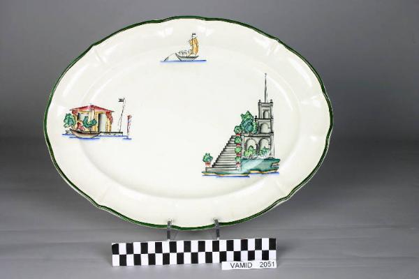 Piatto da portata ovale grande in pasta avorio con tesa sagomata e profilata da una linea verde scuro. Sul fondo e sulla tesa tre scorci lacustri in policromia.