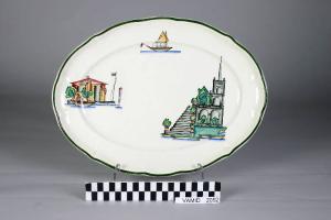 Piatto da portata ovale in pasta avorio con tesa sagomata e profilata da una linea verde scuro. Sul fondo e sulla tesa tre scorci lacustri in policromia.