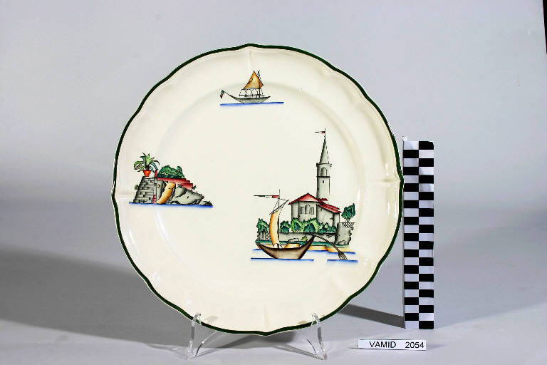 - NOTIZIE STORICO CRITICHE Il piatto, in serie con altri aventi decori diversi, fa parte di un servizio da tavola della forma "Vecchio Milano" con decoro "Lago Maggiore" n. 6641 (num. inv. 2051...3517). In questo esemplare sono raffigurati elementi caratteristici della vita sul lago (un attracco con scaletta e piante, un battello a vapore in navigazione e una boa luminosa) rappresentati in un'atmosfera sospesa e silenziosa, seppur ridente nella resa stilizzata e nel fresco cromatismo delle raffigurazioni. In terraglia forte il servizio "Vecchio Milano" venne prodotto dalla "S.C.I." a partire dal 1923. Il fatto che il decoro "Lago Maggiore" non sia riportato sul catalogo del 1926 induce a pensare che sia stato creato dall'Andlovitz dopo questa data. La sua ideazione, pertanto, viene a collocarsi molto probabilmente tra il 1926 e il 1927, cioè tra il catalogo aziendale e la nascita della nuova forma per la III Biennale di Monza. Nel 1931 l'Andlovitz, che fin dalla sua nomina a direttore artistico si prefisse di rigenerare le forme tradizionali con decori nuovi, adattò alla forma "Vecchio Milano" il nuovissimo decoro "Lago Maggiore", a conferma che una decorazione nuova, se concepita organicamente, può conferire un aspetto attuale e "scattante" anche a una bella forma tradizionale. Nell'ambito dei repertori decorativi creati dall'Andlovitz il decoro "Lago Maggiore" rappresenta un modo frazionato di raffigurare il paesaggio, definito da Mario Munari a "scena spezzata". L'impianto decorativo di queste ceramiche rifugge dalla centralità e dalle strutturazioni lungo direttrici ortogonali, mentre vi predominano l'asimmetria e le fughe visuali sghembe che risentono del gusto per la cineseria e il giapponismo. La semplificazione geometrica degli elementi e il modo di sfumare i corpi nel'intento di suggerirne la volumetria ricorda le opere di Carlo Carrà degli anni venti. Nel decoro "Lago Maggiore" sono presenti espressioni diversificate di un tema molto caro a Guido Andlovitz: i "paesaggi d'acqua" con particolare ricorrenza delle 'barche' raffigurate in una vasta gamma di tipi, generalmente riprese da modelli reali e con divertenti variazioni fantastiche. Il decoro "Lago" fu applicato in un primo momento sulla forma "Vecchio Milano", poi sulla forma "Pomezia" (1936 ca.). Di tale decoro esistono diversi disegni originali a matita, pastello, inchiostro e acquerello su carta conservati nel fondo archivistico della "S.C.I.": alcuni di questi raffigurano il decoro proprio sulla forma "Vecchio Milano" con le rifiniture che compaiono sui pezzi finiti. Nel Museo sono conservati anche un servizio da tavola (num. inv. 2667...2911) e un servizio da caffè (num. inv. 2672...2900) forma "Vecchio Milano" con decoro "Lago Maggiore" con filettaura policroma. Negli anni '90 la Richard Ginori ha rimesso in produzione il servizio "Lago". \nIl servizio in esame è eseguito a colaggio, mentre i decori sono realizzati a decalcomania e dipinti a mano: si vedano a tal proposito le lastre in rame acciaiato conservate nel Midec e raffiguranti molti dei decori presenti nel servizio in combinazioni diversificate (inv. 2480, 2483, 2484, 2485).\nIl piatto fa parte di una donazione di privati al Museo (Stoppani Piera).
