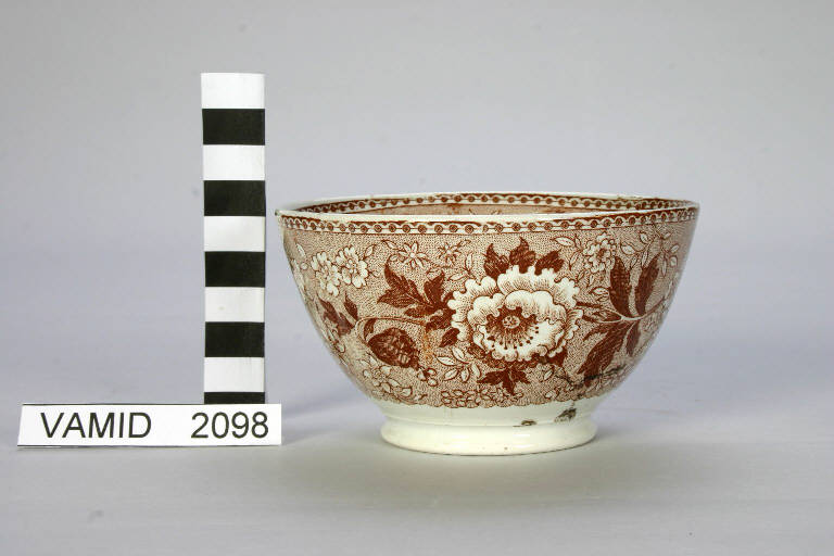 - NOTIZIE STORICO CRITICHE La ciotola è decorata con transfer di colore marrone, applicato sottosmalto. Questa tipologia di decoro si evolve secondo una progressione stilistica: prima le palmette e i fiorami che sono tipici degli anni 1825-1850 e mantengono un legame con il gusto neoclassico; poi i racemi vitinei o altro (uva e pampini), risalenti agli anni 1830-1840, e infine i fiori naturalistici. Queste decorazioni derivano dalla produzione dell'inglese Joshua Wedgwood (1730-1795), che fu il più famoso creatore e imprenditore della ceramica, con un gusto al tempo stesso sobrio e ricco, perfettamente intonato all'elegante stile Adam degli interni neoclassici. Il suo nome è legato all'elaborazione delle terraglie.