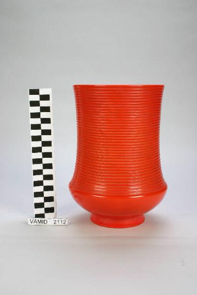 Vaso portafiori con fondo a ciotola e largo collo segnato da coste orizzontali.