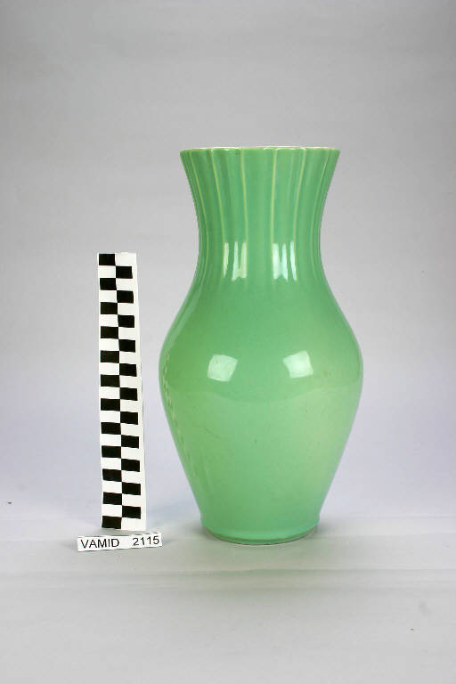 Vaso portafiori leggermente panciuto con largo collo svasato e scanalato.