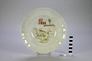 Piatto fondo circolare con tesa ondulata e bordo leggermente arcuato e modellato con una profilatura incisa; fondo color bianco avorio con animali policromi nel cavetto.