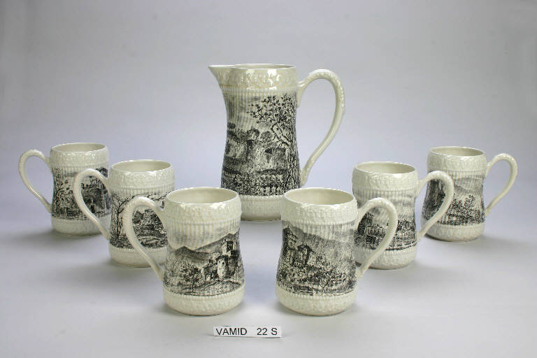 - NOTIZIE STORICO CRITICHE Circa degli anni Sessanta è il servizio da birra in terraglia forte e decorato a bulino, composto da una brocca e da sei boccali ciascuno con una diversa decorazione. I boccali sono di color avorio decorati a rilievo lungo la base e l’orlo con un fregio a motivi vegetali tipo “palmette”, il corpo è decorato a piccole coste verticali serpentinate e con una veduta stampata in nero e grigio, il manico, anch’esso a rilievo, è fasciato di foglie.\nLe vedute rappresentate sui boccali sono: quella del castello di Fenis ad Aosta, il castello di Issogne ad Aosta, il castello Malaspina in Toscana, il castello di Sirmione sul Lago di Garda, il castello Visconti Somma in Lombardia, il castello di Monforte a Campobasso; infine, sulla brocca vi è rappresentato il castello di Gorizia.