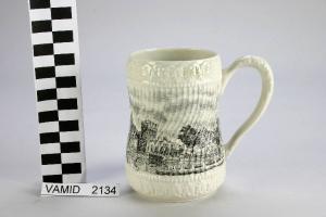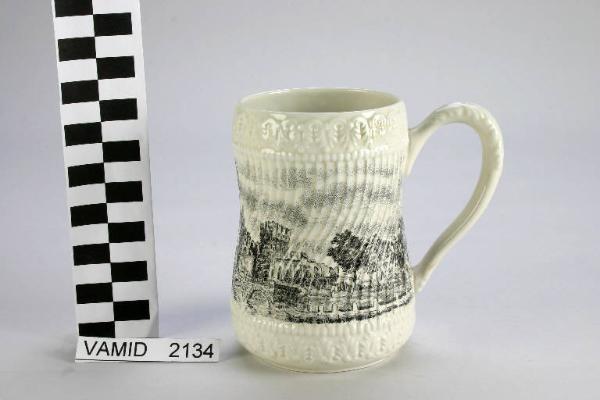 Boccale color avorio decorato a rilievo lungo la base e l'orlo con un fregio a motivi vegetali tipo "palmette", corpo decorato a piccole coste verticali serpentinate, manico anch'esso a rilievo fasciato di foglie. Il corpo è decorato con una veduta stampata in nero e grigio.