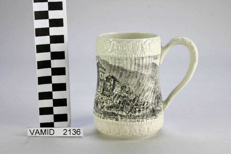 Boccale color avorio decorato a rilievo lungo la base e l'orlo con un fregio a motivi vegetali tipo "palmette", corpo decorato a piccole coste verticali serpentinate, manico anch'esso a rilievo fasciato di foglie. Il corpo è decorato con una veduta stampata in nero e grigio.