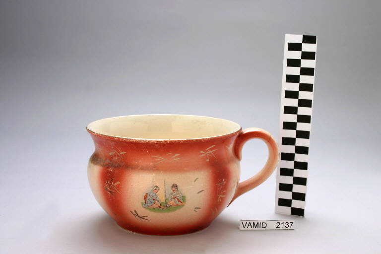 Pitale smaltato di rosso e rosa sfumati tra loro e punteggiati con motivo a ideogrammi giapponesi; due piccole scene giapponesi.