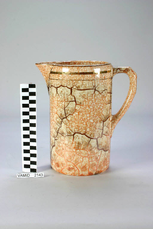 Brocca di forma cilindrica con beccuccio triangolare e manico a profilo mistilineo; decoro all'esterno e all'interno con smalto ad effetto "cracquelure" e rifiniture con fascia e filettature in oro brillante.