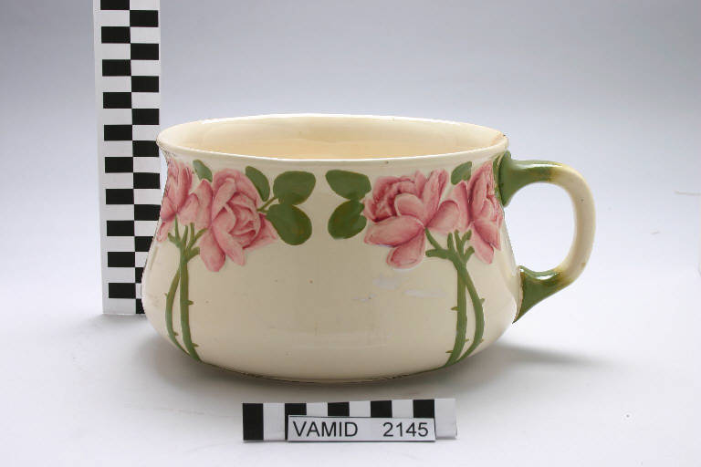 Pitale di forma panciuta in pasta avorio con decorazione floreale a rilievo e manico a "C".
