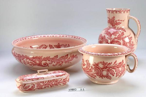 Servizio igienico da camera in pasta rosa con decoro vegetale, composto da un pitale, un portasapone, una brocca e un catino.