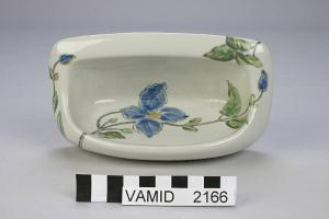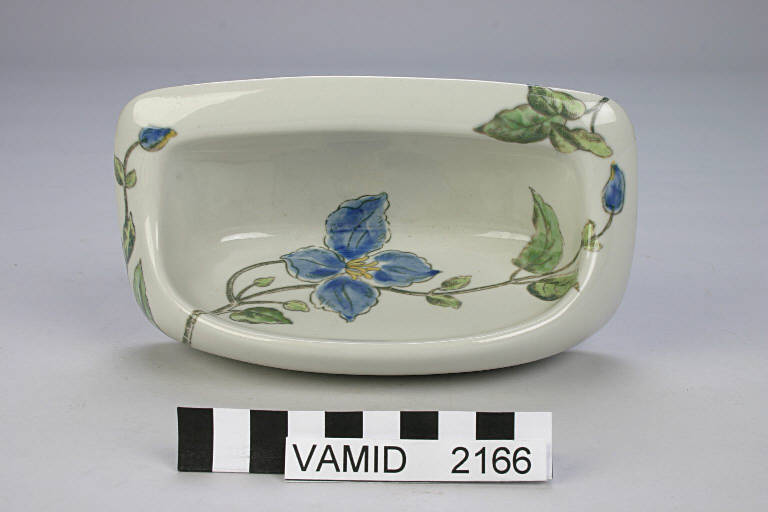 - NOTIZIE STORICO CRITICHE Il portasapone fa parte di un servizio di accessori da bagno risalente alla metà del XX secolo. Completa il servizio anche un lavandino similmente decorato (scheda Peregalli n. 55).