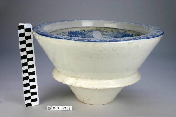 Water closet a forma conica in pasta bianca con interno e bordo smaltati in blu, grande foro circolare in basso per lo scarico, foro medio in alto per l'alimentazione dell'acqua, due forellini ai lati di quest'ultimo.