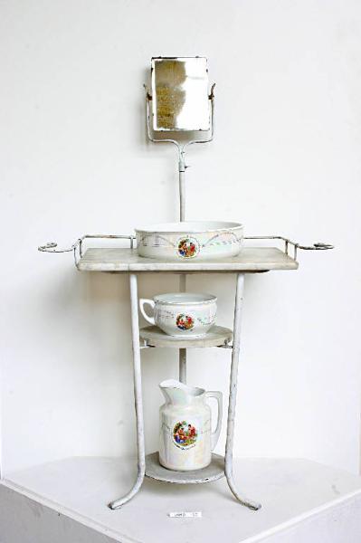 Servizio igienico da camera in terraglia decorata con decalcomanie tratte da opere di Angelica Kauffman; si compone di un pitale, un catino, una brocca e una struttura metallica di sostegno.