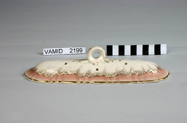 Portasapone in pasta avorio di forma oblunga con coperchio fornito di manichino apicale a occhiello; fori sul recipiente e sul coperchio per l'evaporazione dell'acqua.