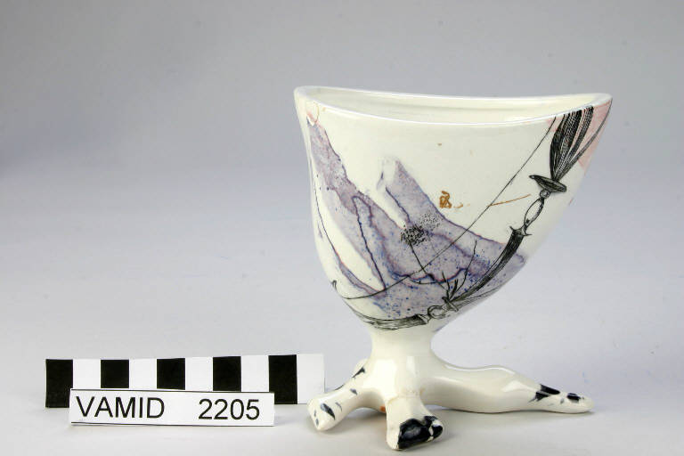 - NOTIZIE STORICO CRITICHE La zuccheriera (recipiente inv. n. 2205, coperchio n. 2206) appartiene a un servizio da thè decorato con smalti di color nero, viola e rosa e con decori applicati a stampa sottosmalto. Questo servizio da thè "a forma di gallina", spigoloso e surreale, fu esposto alla Triennale di Milano del 1951: Gio Ponti commentò sulla rivista Domus di quell'anno (n. 260, luglio-agosto) che il servizio "apparterrà non alla storia del costume, ma alla storia del gusto e si avvicinerà nelle 'vetrine' di casa a tanti predecessori, servizi da vedere e non toccare. E' un servizio 'in marcia', uccelliforme: l'astrattismo (o concretismo formale) sbocca spesso (o prende le mosse) in forme naturalistiche, animaliformi. I suoi presupposti sono più vicini alla natura che alla geometria, all'analisi psichica che a quella geometrica... Queste ceramiche non solo si muovono, ma saltellano, sculettano, lanciano stridii". Il servizio entrò poi in produzione come piccola serie e con l'aggiunta di altre decorazioni rispetto a quello della Triennale. Sul corpo del servizio si dipana un filamentoso disegno di Antonia Campi, con aloni dai colori improbabili (Biffi Gentili). Il servizio, che segna "una decisa rottura con l'estetica delle linee chiare del modernismo degli anni '30" (catalogo della mostra "The new look"), è riportato nel catalogo di scelta degli "Articoli fantasia" della S. C. I. Laveno con denominazione "Servizio da thè C. 73".