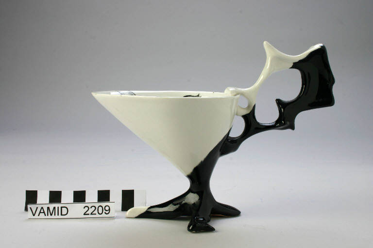 - NOTIZIE STORICO CRITICHE La tazza appartiene a un servizio da thè decorato con smalti di color nero, viola e rosa e con decori applicati a stampa sottosmalto. Questo servizio da thè "a forma di gallina", spigoloso e surreale, fu esposto alla Triennale di Milano del 1951: Gio Ponti commentò sulla rivista Domus di quell'anno (n. 260, luglio-agosto) che il servizio "apparterrà non alla storia del costume, ma alla storia del gusto e si avvicinerà nelle 'vetrine' di casa a tanti predecessori, servizi da vedere e non toccare. E' un servizio 'in marcia', uccelliforme: l'astrattismo (o concretismo formale) sbocca spesso (o prende le mosse) in forme naturalistiche, animaliformi. I suoi presupposti sono più vicini alla natura che alla geometria, all'analisi psichica che a quella geometrica... Queste ceramiche non solo si muovono, ma saltellano, sculettano, lanciano stridii". Il servizio entrò poi in produzione come piccola serie e con l'aggiunta di altre decorazioni rispetto a quello della Triennale. Sul corpo del servizio si dipana un filamentoso disegno di Antonia Campi, con aloni dai colori improbabili (Biffi Gentili). Il servizio, che segna "una decisa rottura con l'estetica delle linee chiare del modernismo degli anni '30" (catalogo della mostra "The new look"), è riportato nel catalogo di scelta degli "Articoli fantasia" della S. C. I. Laveno con denominazione "Servizio da thè C. 73".