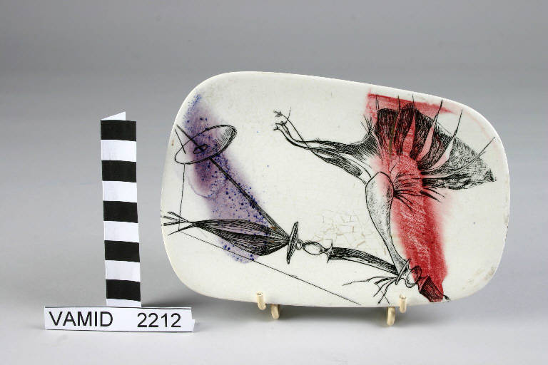 - NOTIZIE STORICO CRITICHE Il piattino appartiene a un servizio da thè decorato con smalti di color nero, viola e rosa e con decori applicati a stampa sottosmalto. Questo servizio da thè "a forma di gallina", spigoloso e surreale, fu esposto alla Triennale di Milano del 1951: Gio Ponti commentò sulla rivista Domus di quell'anno (n. 260, luglio-agosto) che il servizio "apparterrà non alla storia del costume, ma alla storia del gusto e si avvicinerà nelle 'vetrine' di casa a tanti predecessori, servizi da vedere e non toccare. E' un servizio 'in marcia', uccelliforme: l'astrattismo (o concretismo formale) sbocca spesso (o prende le mosse) in forme naturalistiche, animaliformi. I suoi presupposti sono più vicini alla natura che alla geometria, all'analisi psichica che a quella geometrica... Queste ceramiche non solo si muovono, ma saltellano, sculettano, lanciano stridii". Il servizio entrò poi in produzione come piccola serie e con l'aggiunta di altre decorazioni rispetto a quello della Triennale. Sul corpo del servizio si dipana un filamentoso disegno di Antonia Campi, con aloni dai colori improbabili (Biffi Gentili). Il servizio, che segna "una decisa rottura con l'estetica delle linee chiare del modernismo degli anni '30" (catalogo della mostra "The new look"), è riportato nel catalogo di scelta degli "Articoli fantasia" della S. C. I. Laveno con denominazione "Servizio da thè C. 73".