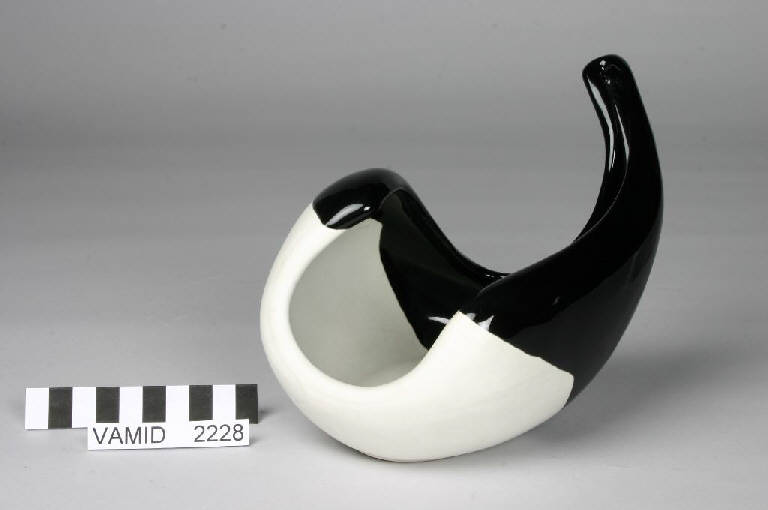 Coppetta di foggia fantastica, smaltata all'interno e all'esterno in bicromia bianco opaco-nero lucido.